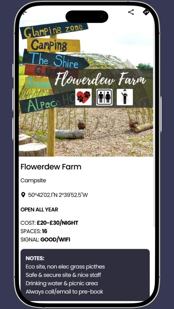 This small rural camping spot offers just 2–4 spaces, open all year with good mobile signal.