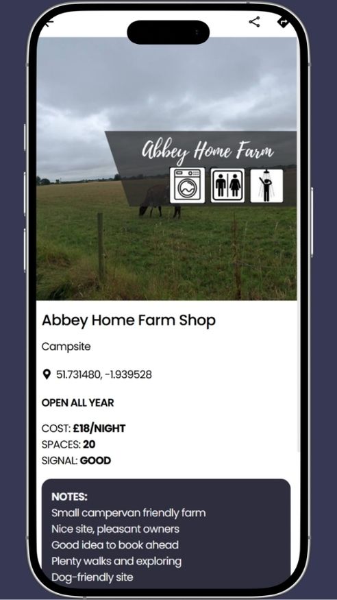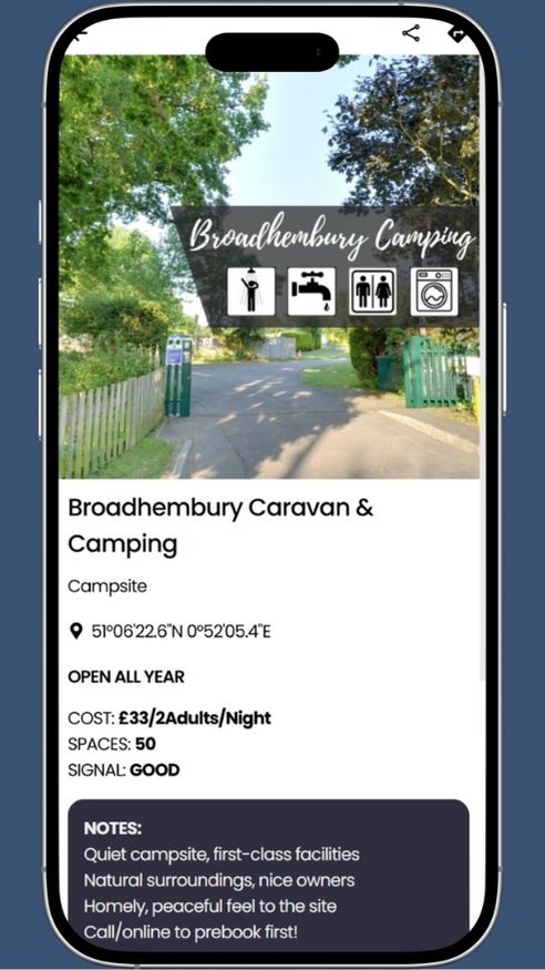This simple touring field offers around 15 spaces, open most of the year with good signal, and good amenities on site, low cost too.